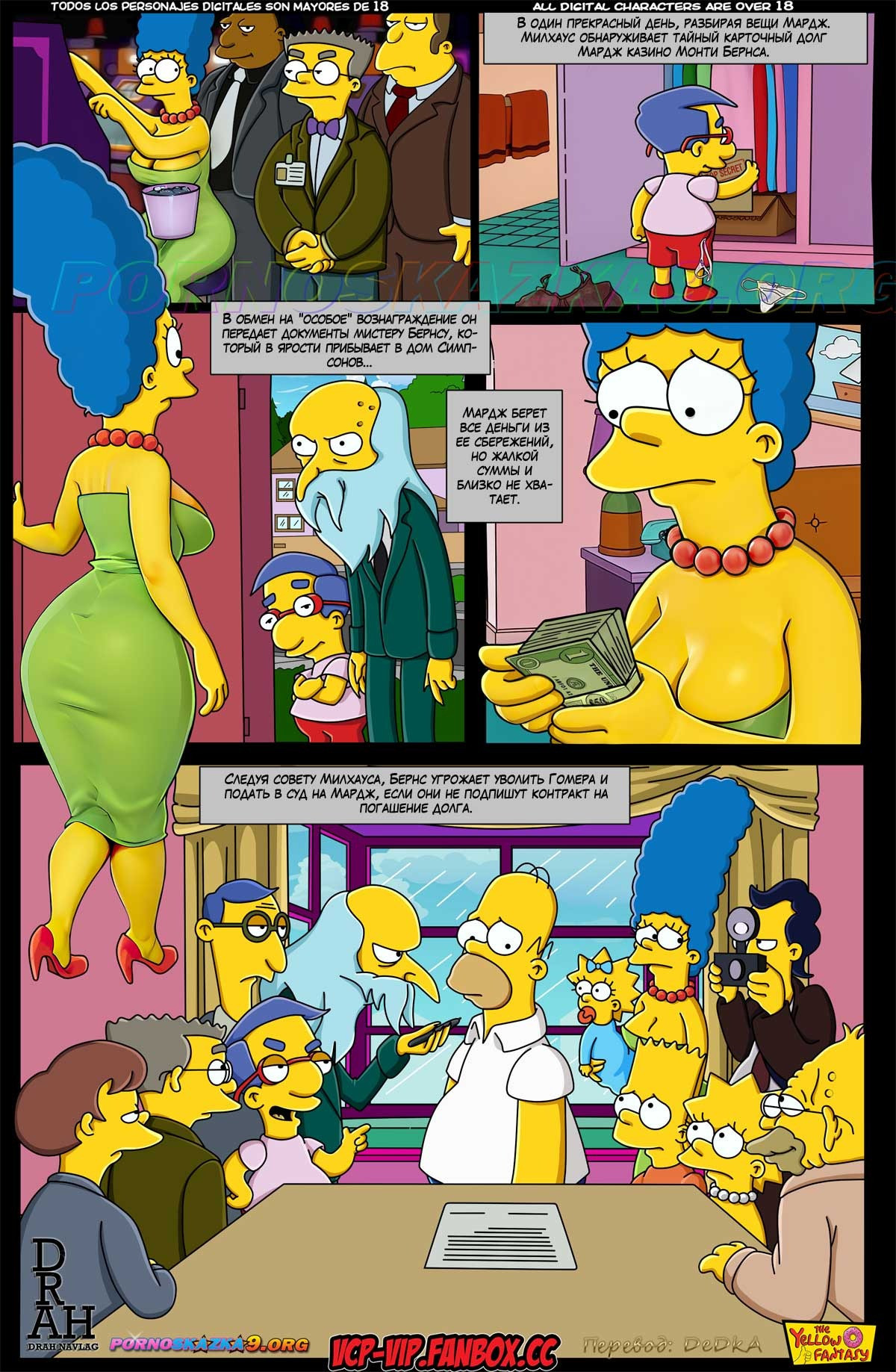 Порно комикс Симпсоны. Желтая фантазия. Дома и стены помогают. Милхаус обнаружил документы, подтверждающие тайный карточный долг Мардж казино Монти Бернса. В обмен на «особое» вознаграждение он передает документы мистеру Бернсу, который в ярости прибывает в дом Симпсонов…