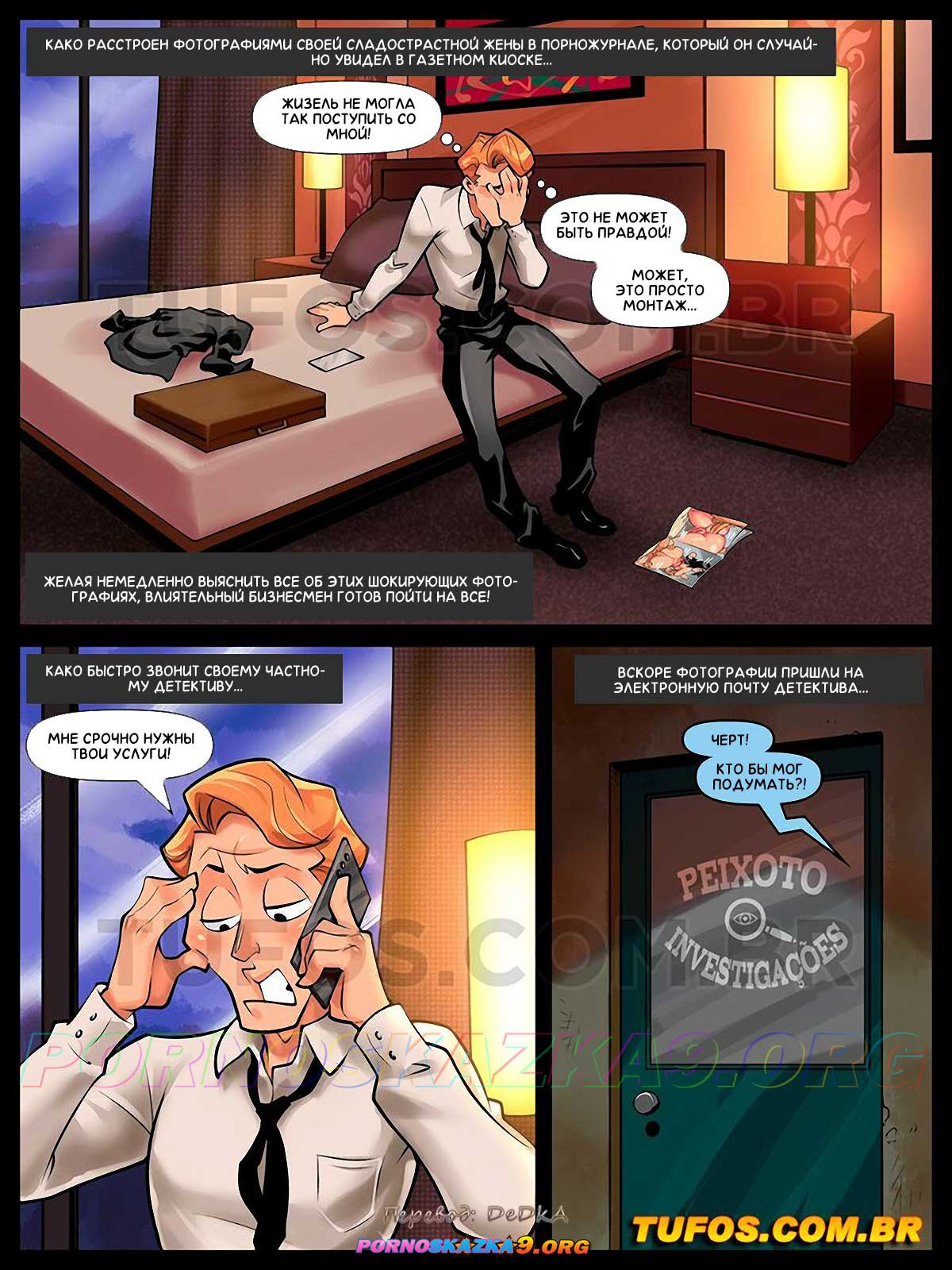 Порно комикс Сладострастные домохозяйки. Часть 11: Глубокое расследование. Влиятельный бизнесмен шокирован фотографиями своей жены в порнографическом журнале, который он случайно увидел в газетном киоске… Сомневаясь в подлинности фотографий, он обращается к частному детективу, который начал свое расследование со встречи с женой бизнесмена…