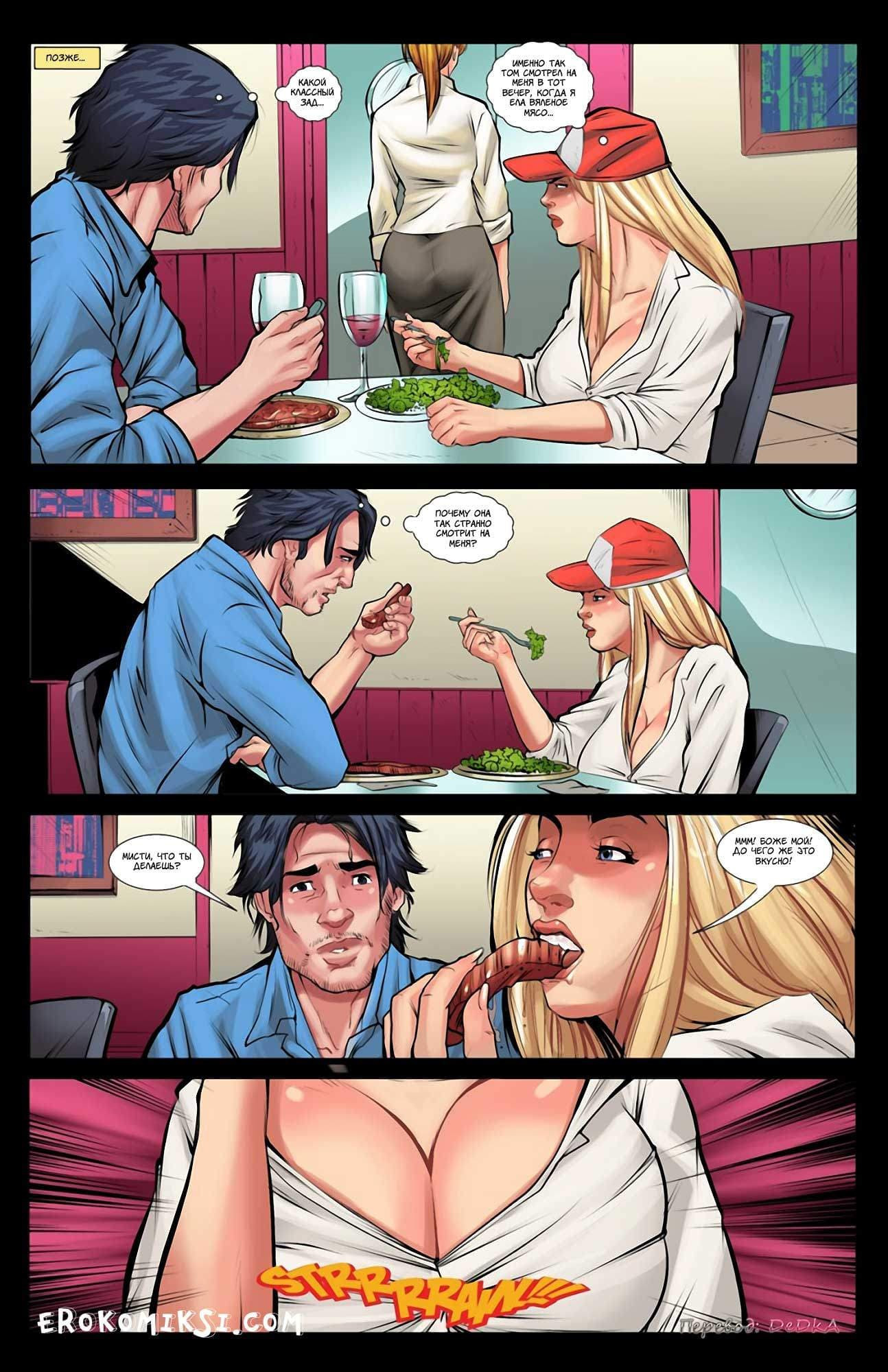 В первой части порно комикс Только не мясо рассказывается о том, как подруга Тома, Мисти, живёт у него уже больше месяца, но… она до сих пор не спала с ним, и, кажется, совсем не проявляет интереса к сексу. Том уже начал задумываться, а нужна ли ему такая подруга? Но однажды всё резко изменилось, и причиной всему стало, как не странно, мясо!