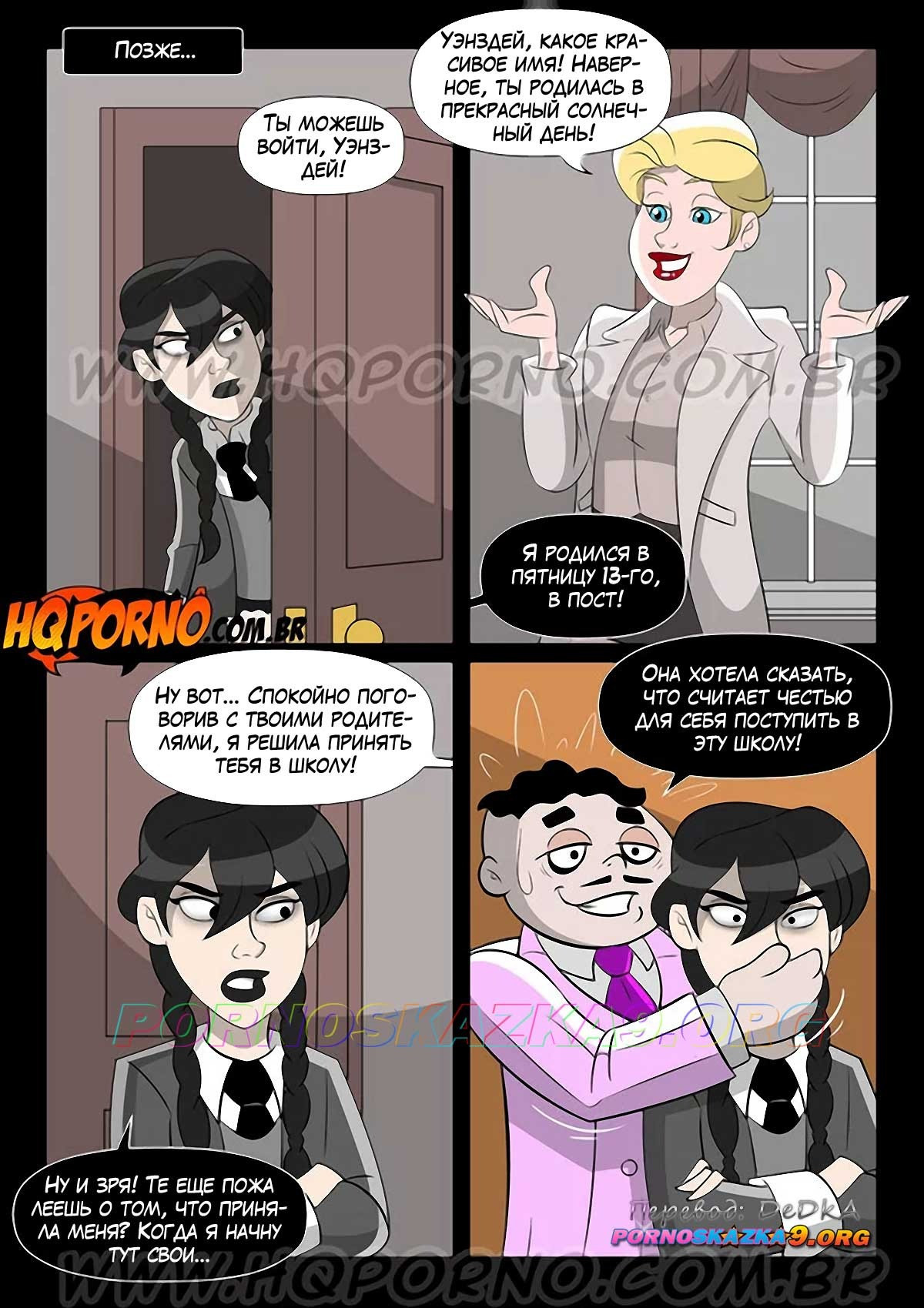 Порно комикс Уэнздей. Часть 3. Никогда больше. Мортиша и Гомес пытаются сделать все возможное, чтобы Уэнздей взяли в новую школу, но для этого им необходимо обязательно убедить директоршу. В то же время Уэнздей хочет поближе познакомиться с будущими своими одноклассниками…