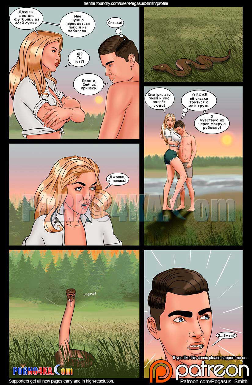 Порно комикс Заблудившиеся в лесу. Аппетитная блондинка отправилась в лес со свои парнем. Они играли в волейбол у озера. Игра была классной, и если бы не змея, которая пыталась укусить девушку, все было бы просто супер! Парень прогнал её и девушка решила его отблагодарить за его подвиг, а как, вы узнаете далее…